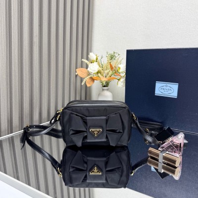 프라다 리나일론 앤 나파 레더 미니 숄더백 보우 카멜 블랙1BH166 NMW